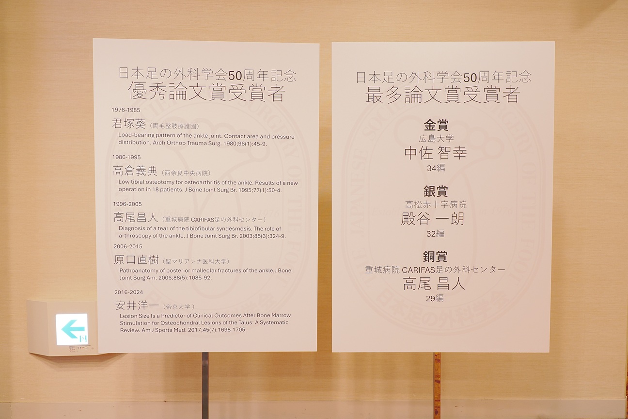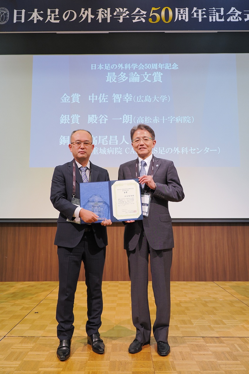 2025年11月13日に開催された日本足の外科学会50周年記念式典にて、当教室の中佐 智幸先生が日本足の外科学会50周年記念最多論文賞 金賞を受賞しました。(論文数34編)